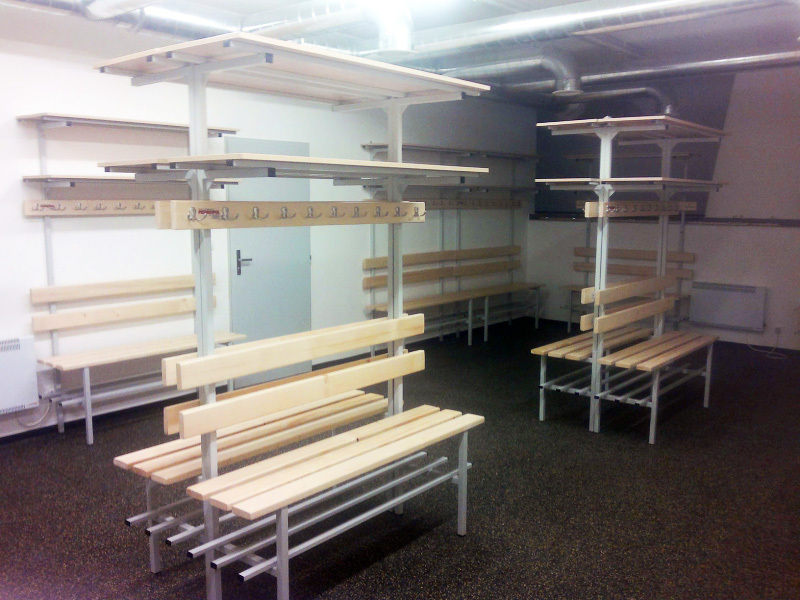 A padok hoki öltözők és téli stadionok számára alkalmasak. Acélszerkezetből készült, deszkákkal és rétegelt lemezekkel kombinálva. A padok méretei: magasság 2020 mm, mélység 425 mm, szabványhossz 1400 mm (az ügyfél kérésére a ruhatár méretének megfelelően mérjük), ülőmagasság 500 mm. Akasztók száma szabványos hosszúságban 20 db. A padoknak van egy felső és alsó tárolótere. Felületkezelés, a RAL paletta szerinti szín, fa és rétegelt lemez természetes színben.