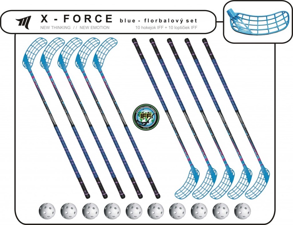 Az MPS X-FORCE BLUE focipálya tartalmaz: • 10 darab szénszálas IFF-bot, 100 cm hosszú, pengével hossza 111 cm, keménység 26 mm, penge bal / jobb SHOOT IFF, markolat DUAL / SUPER GRIP - fekete, csúszásmentes, verejtékeket felszívó. A bot tömege 252 g. • 10 db - TRIX IFF gömbök műanyagból - PA, gömb átmérője 72 mm, súly 23 g. • A jégkorong-botokat és a labdákat a Nemzetközi Floorball Szövetség IFF tanúsítja