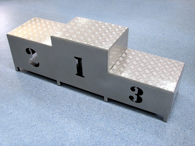 A nyertesek dobogója acélszerkezetből, a burkolat acéllemezből, a teteje fémcsúszásgátló lemezből készül. A lépést 1 és 3 közötti számok jelölik, az egyes lépések különböző magasságával. Méretek: hosszúság: 150 cm, szélesség: 40 cm, a legmagasabb pont magassága 50 cm.